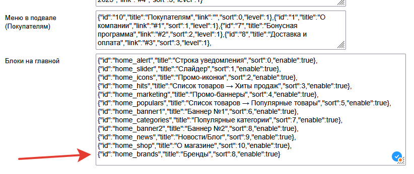 1) В разделе Настройки, добавьте новую строчку в самом конце окна - {"id":"home_brands","title":"Бренды","sort":8,"enable":true} (не забудьте добавить запятую в конце предыдущего блока)