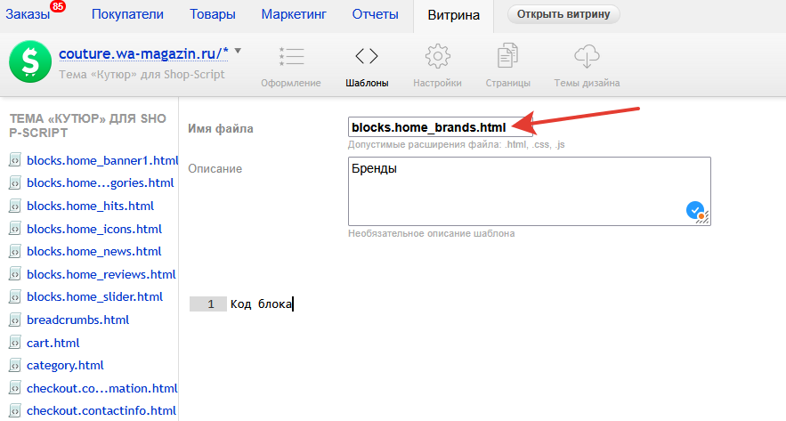 2) Создайте файл с именем нового блока, в данном примере blocks.home_brands.html и наполните его контетом или кодом плагина.